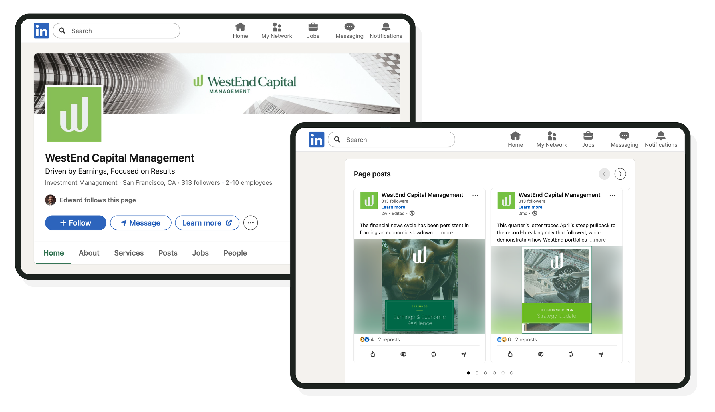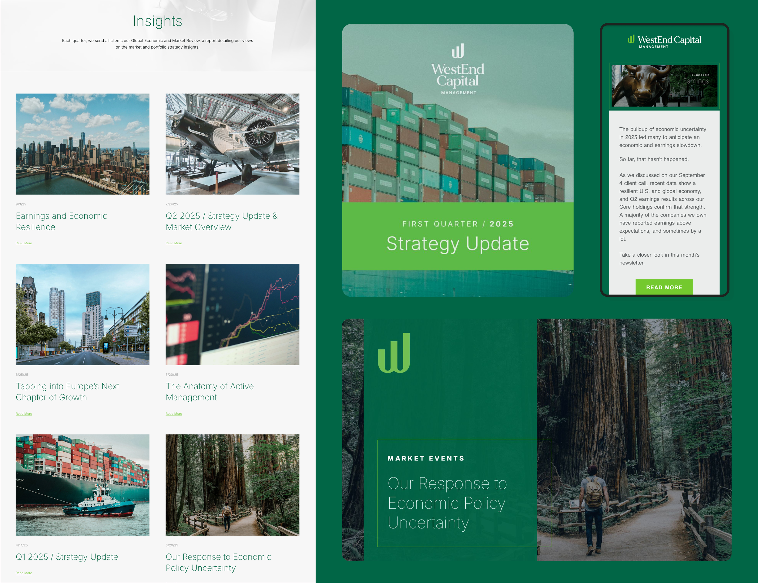 WestEnd Capital Management partnered with us to elevate their communication strategy. A redesigned website reflects their bold investment philosophy, while a new pitch deck, monthly newsletters, quarterly reviews, and LinkedIn posts keep their audience informed and engaged.